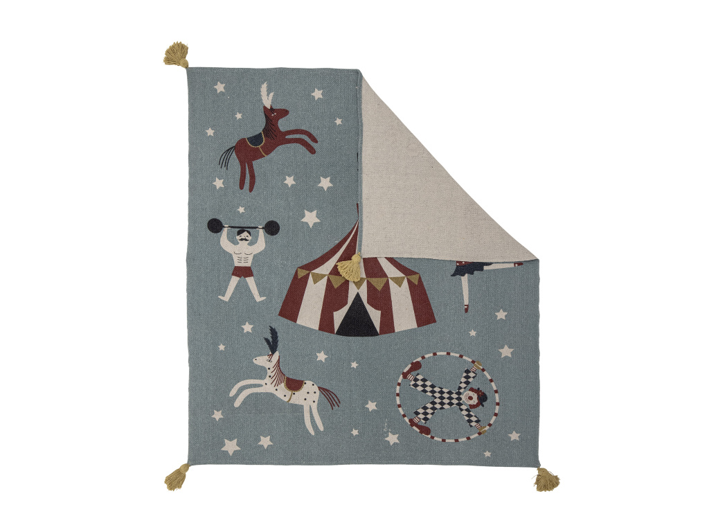 Je vyroben z recyklovaného bavlněného materiálu a má střapce, které mu dodávají moderní vzhled.