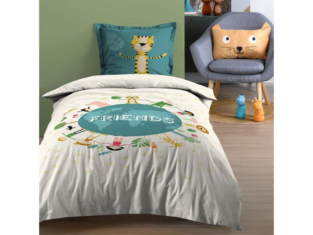 Na polštáři je tygr s lístečkem a na peřině se kamarádí zvířátka a lidé z celého světa.