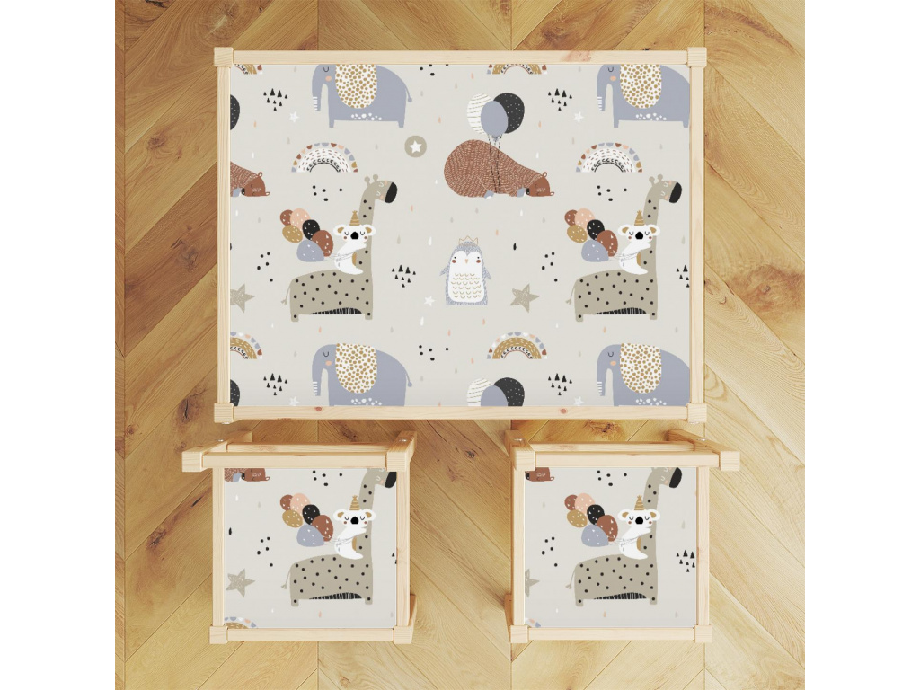 Roztomilý design v přírodních tónech s obrázky různých zvířátek, jako jsou sloni, žirafy, medvědi, tučňák, které spolu s barevnými balonky a duhovými motivy vytvářejí veselou a hravou atmosféru. Vaše děti budou z nového vzhledu svého stolečku a židliček nadšené!