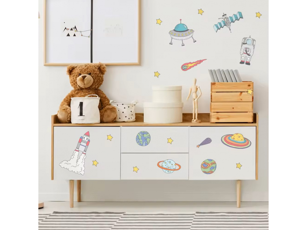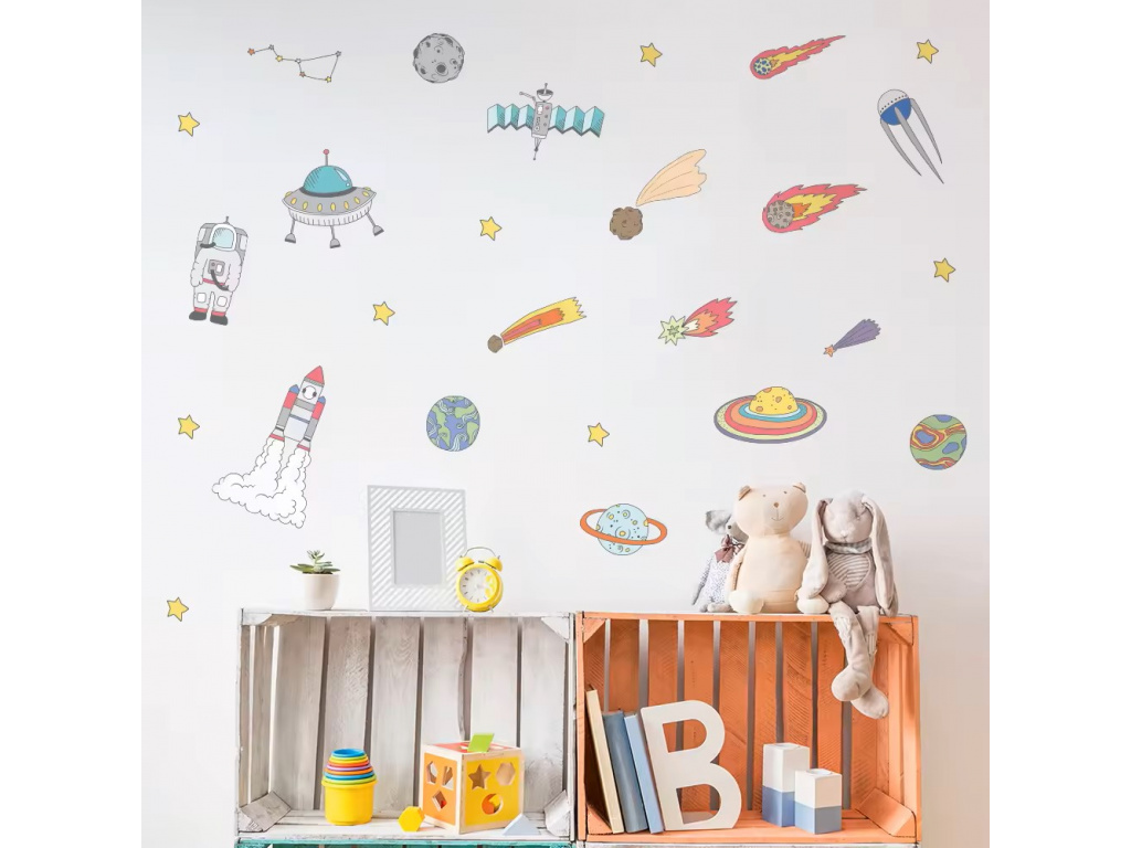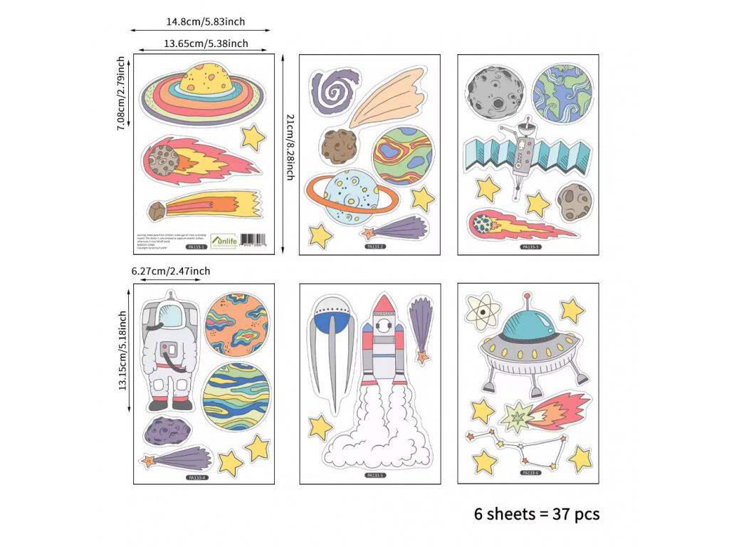 - Rozměry: balení obsahuje 37 samolepek na 6 arších, velikost kosmonauta je zhruba 13 x 6 cm