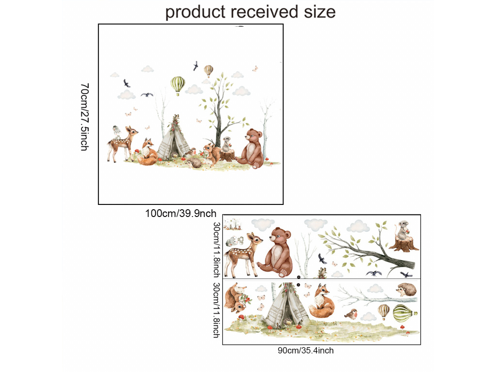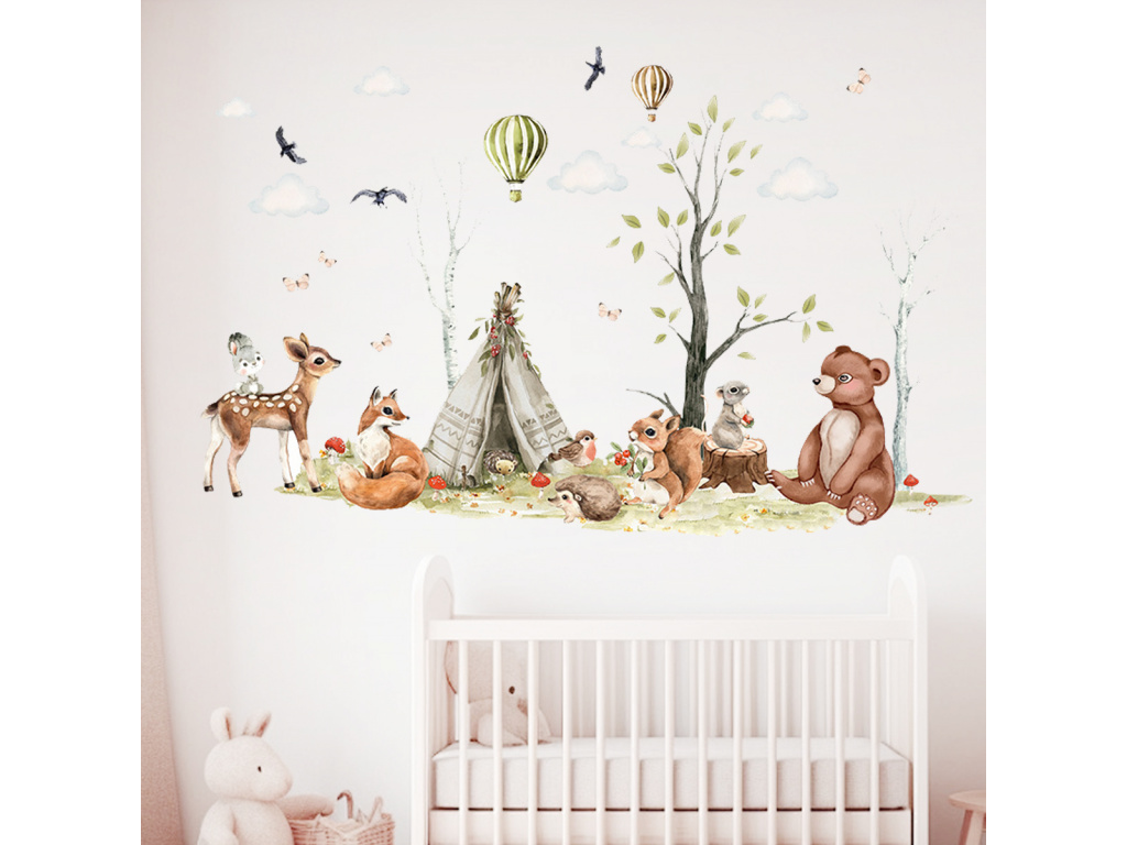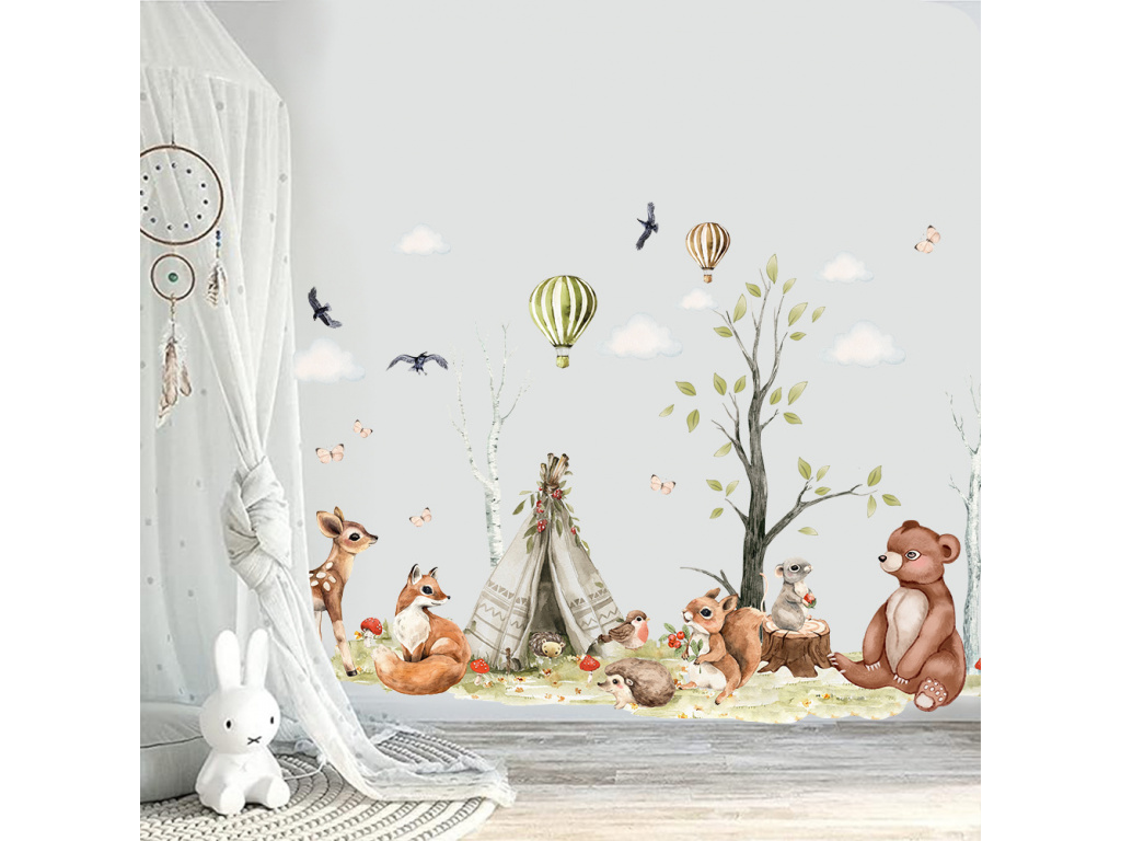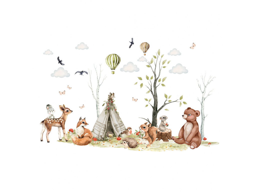 - Motiv: teepee, stromy, srnečka, liška, králíček, veverka, ptáček, ježek, medvídek, balony, mráčky