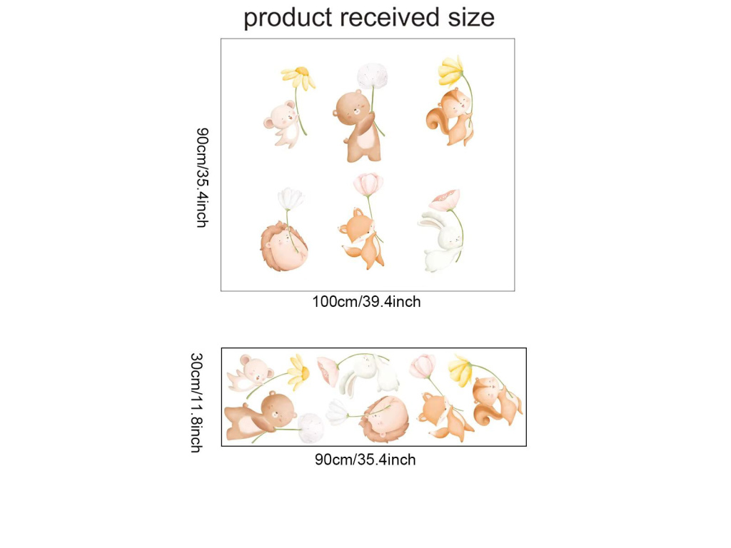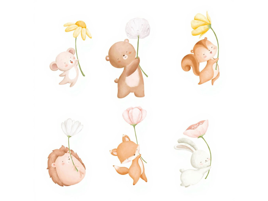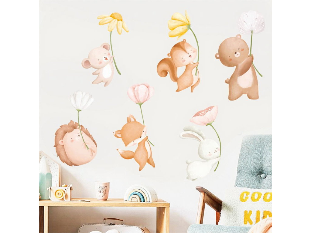 Proměňte dětský pokojíček v kouzelnou zahradu plnou roztomilých kamarádů s touto nástěnnou samolepkou. Jemná akvarelovým stylem namalovaná zvířátka - koala, medvídek, veverka, zajíček, ježek a lištička - se na květinách houpají přímo na vaší zdi a okamžitě vnášejí do prostoru hravou atmosféru a pohádkový nádech.